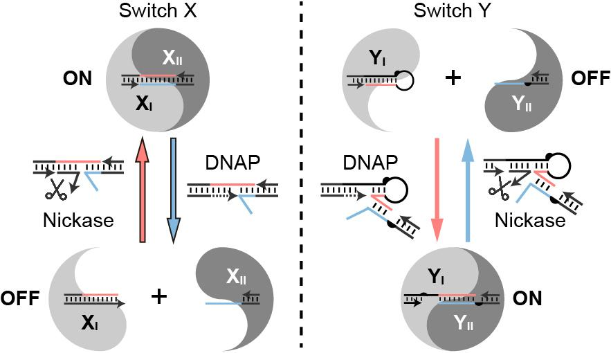 Figure 1. Yin-Yang diagrams of controllable rearrangement of DNA nanostructures driven by DNA-modifying enzymes. Two types of reversible molecular switches, X (left) and Y (right), are driven by the same two enzymes but with opposite reaction flow.