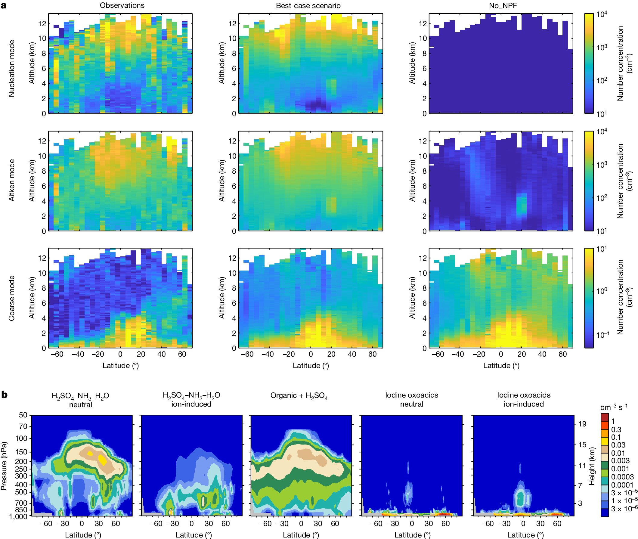 Based on the new model and considering the constraints of observation data, a comprehensive picture of the NPF mechanisms all over the world is presented, demonstrating that the NPF mechanisms vary significantly with region and altitude. Taking the areas with high aerosol concentration or large aerosol radiative forcing as an example, the simulation results demonstrate that pure-organic nucleation dominates at high altitudes in tropical rainforests (Amazon, Central Africa, Southeast Asia, etc.) (Figure 1b); for anthropogenically polluted regions (China, the United States, India, and Europe), amine-H2SO4 nucleation is most likely to dominate near the surface, and H2SO4-HNO3-NH3 nucleation is likely to be the most significant mechanism at high altitudes in Asian monsoon regions such as China and India (Figure 2b); For the Pacific Ocean and the Atlantic Ocean, iodine oxoacids nucleation dominates near the surface, while organic-H2SO4 nucleation and H2SO4-NH3-H2O neutral nucleation are most likely to dominate at high altitudes (Figure 3b). The distribution of global zonal mean NPF rate is largely governed by the hotspot regions above (Figure 4). In the tropical upper troposphere, NPF is dominated by organic-mediated nucleation, especially pure-organic ion-induced nucleation that dominates above the altitude of 11 km. This reflects the NPF mechanisms over the rainforests and tropical oceans. In the boundary layer, amine–H2SO4 nucleation dominates in mid-latitude areas of the Northern Hemisphere, characteristic of anthropogenically polluted regions; iodine oxoacids nucleation dominates at other latitudes because of the vast oceans.