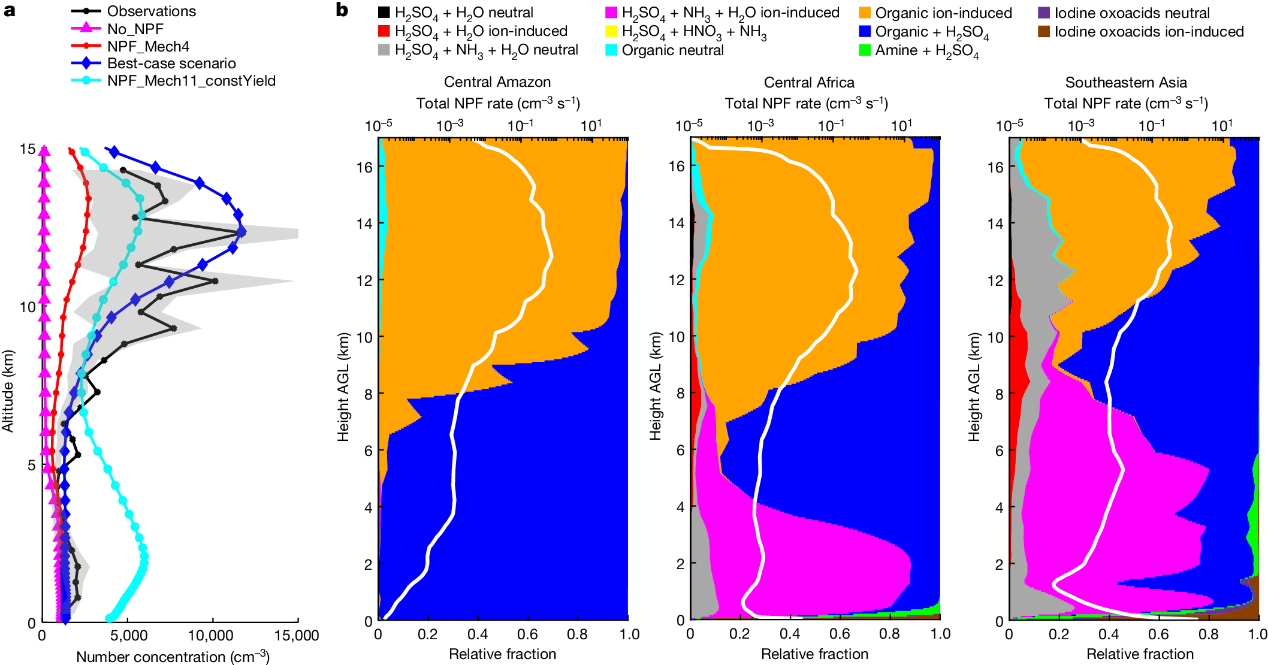 Fig. 1. Mechanisms of NPF and constraints from observations over rainforests. (a) Comparison of simulated particle number concentrations with aircraft measurements obtained over the Amazon; (b) Total NPF rates in 2016 (white lines) and proportion of each mechanism (colored areas) in every tropical rainforest region.
