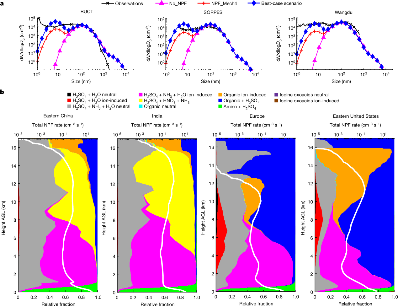 Fig. 2. Mechanisms of NPF and constraints from observations over anthropogenically polluted regions. (a) Comparison of simulated particle number size distributions with observations obtained at three sites in China; (b) Total NPF rates in 2016 (white lines) and proportion of each mechanism (colored areas) in every anthropogenic polluted region.