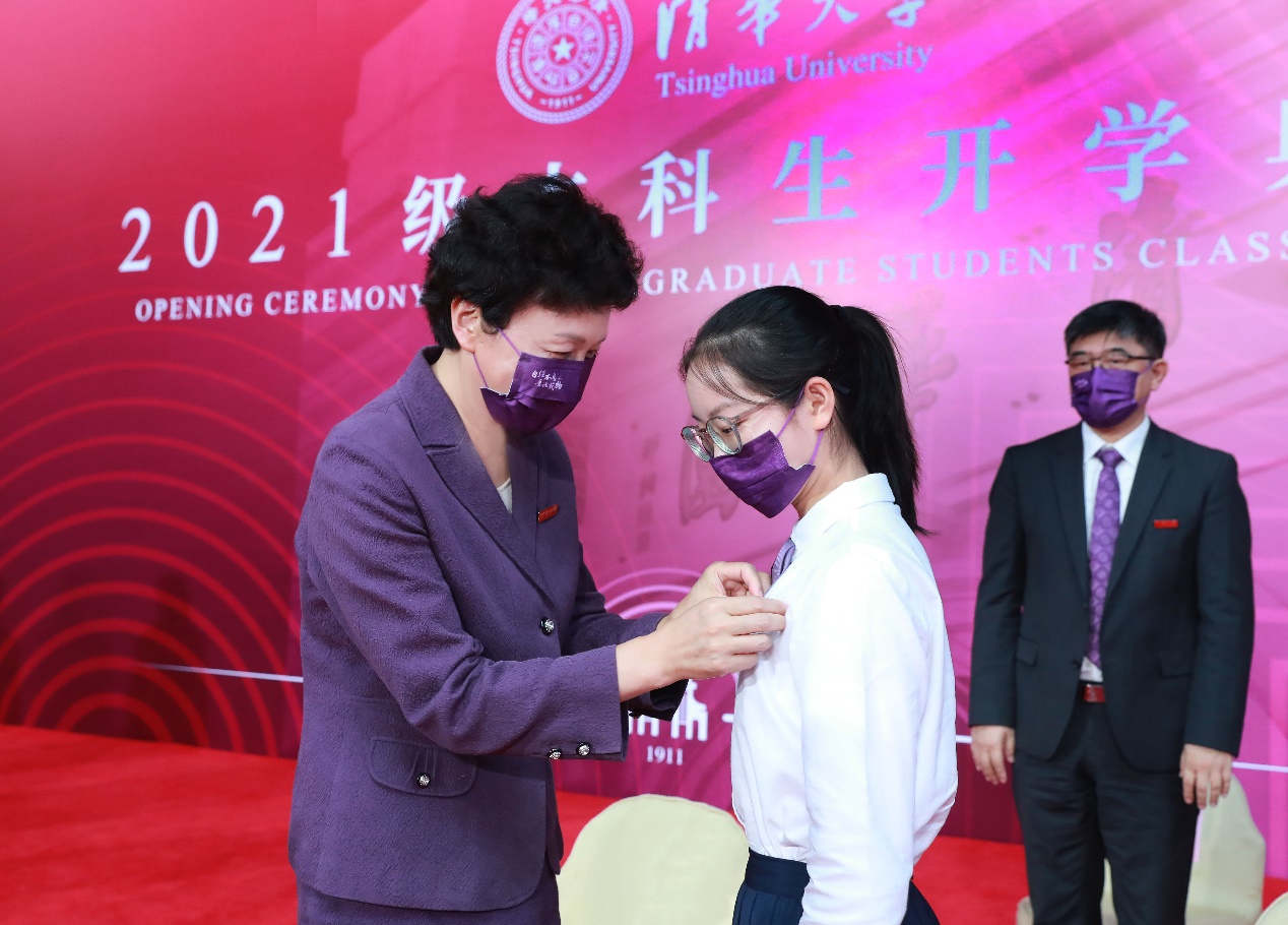 Tsinghua University Council Chairperson Chen Xu wore the Tsinghua badge for the freshmen representative.