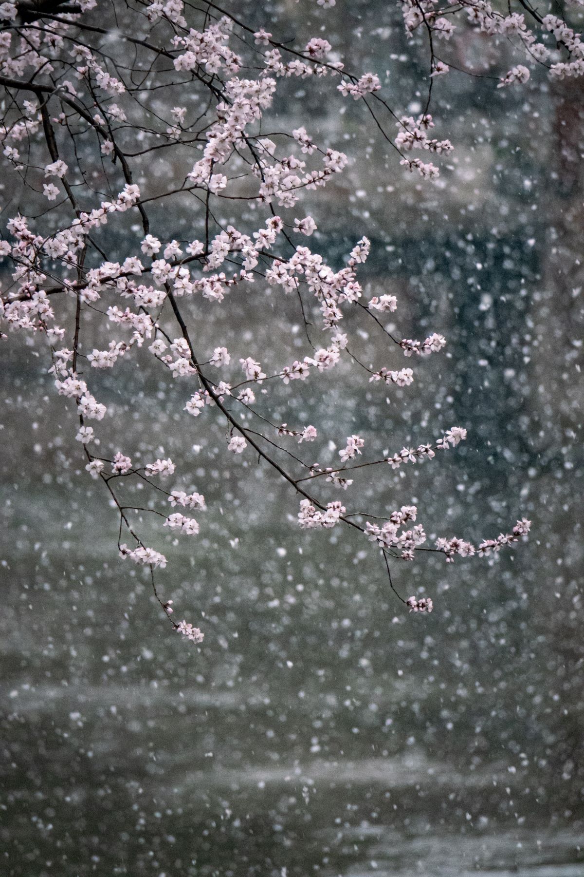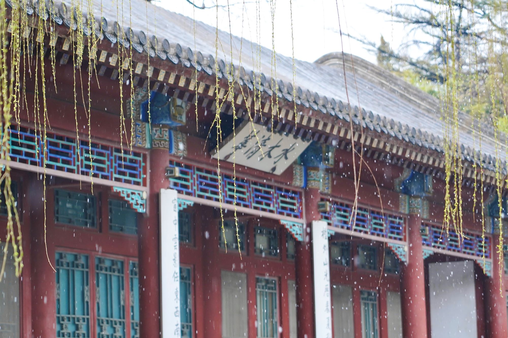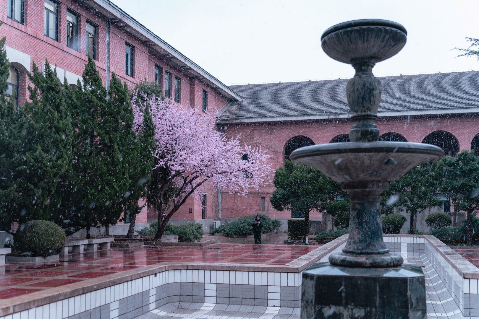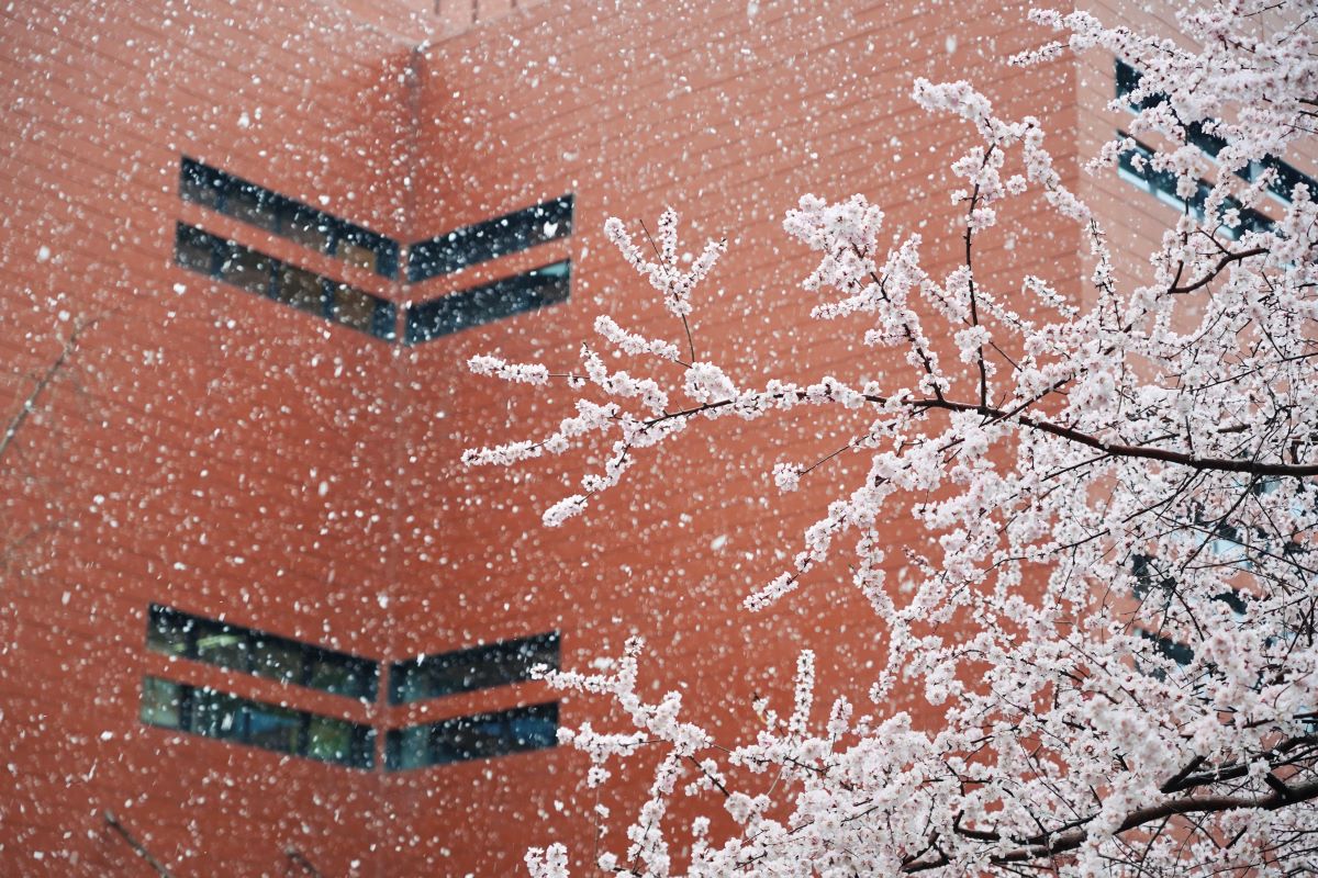 Snowflakes quietly descend upon trees, rooftops of buildings, ponds, as well as shoulders of people walking through Tsinghua's campus.