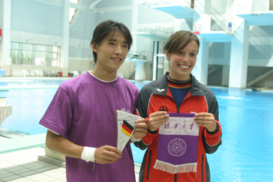 In July of 2003, Tsinghua diving team took part in a contest with German student diving team in Germany on invitation. Tsinghua diving team won 7 champions in 10 individual evens. The contest held this year is a return contest of the contest in 2003. Mr. Nitsche,learder of the Sports Federation of University, Germany, Dr. Rauhut, Rector of RWTH Aachen and Tsinghua Vice President Gong Ke attended the opening ceremony.