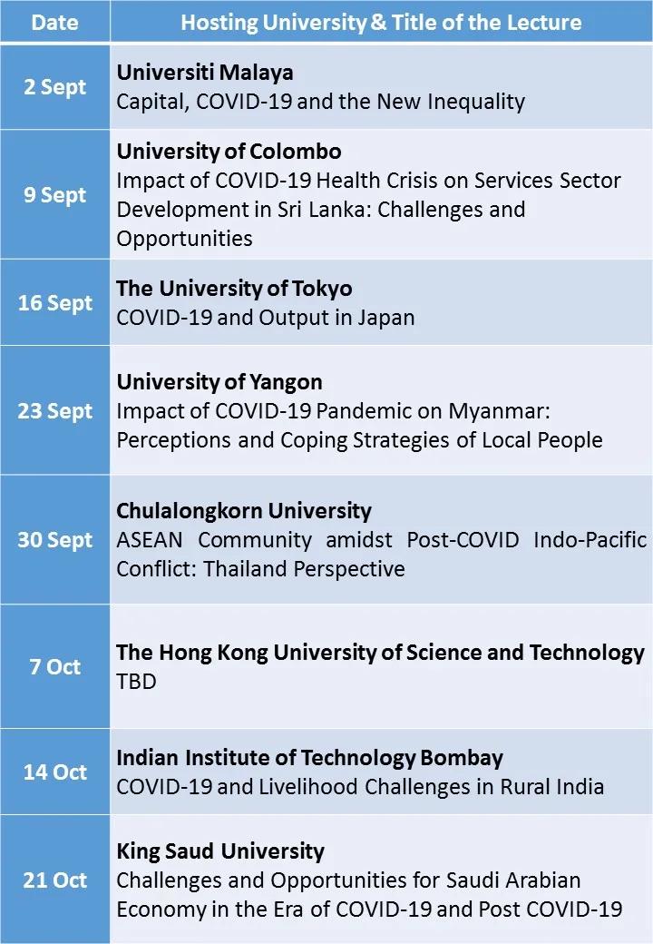 In September 2021, AUA will launch a joint online lecture series as an attempt and first step towards the long-term goal of an online shared course. In the lecture series, 16 eminent scholars from 14 leading universities in Asia will address the challenges and opportunities of Asian economies in the post COVID-19 era.