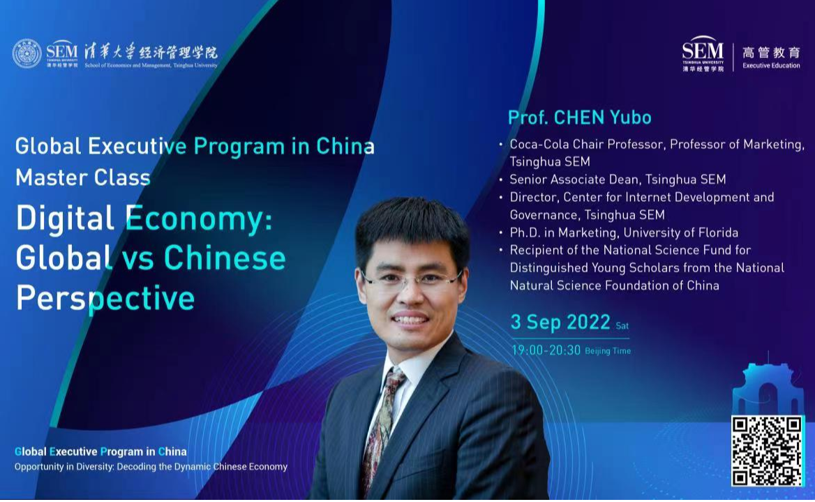 Prof. Yubo Chen, the Senior Associate Dean of Tsinghua SEM will deliver a master class on Digital Economy: Global vs. Chinese Perspective. What is the logic behind business innovations addressing digital transformation in China and whether they can be applied in global markets?
