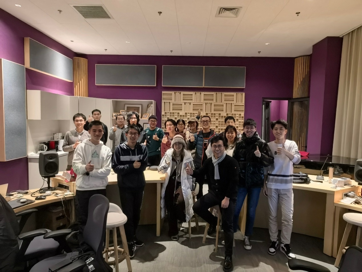 Cheng and his students taking a group photo in the panoramic sound laboratory.
