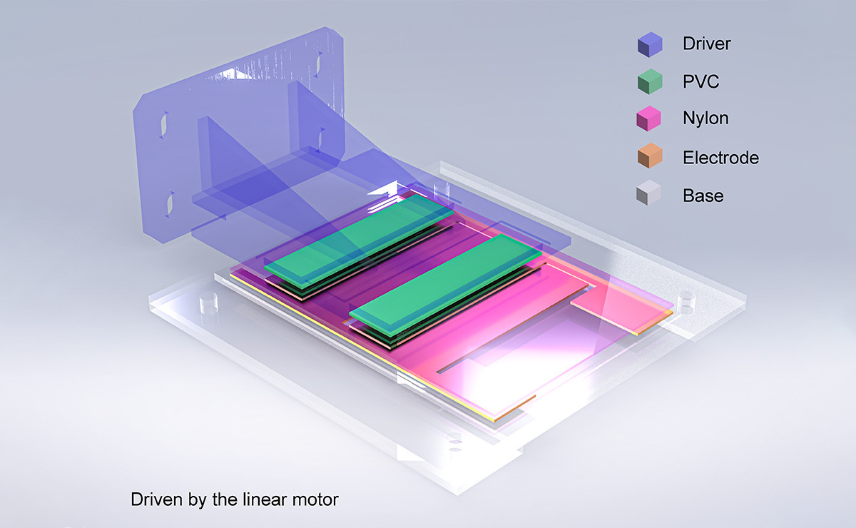 The triboelectric nanogenerator comprises polyvinyl chloride films (green) that slide against the nylon films (pink) and induce charges on the metal electrodes (orange).