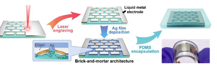 “In our work, we propose a unique brick-and-mortar architecture to cope with this issue,”explains Liu.“This architecture consists of a biphasic pattern, which is the liquid metal with a chromium-copper underlayer as the‘bricks’, and a silver film as the‘mortar’”. The researchers took inspiration from the natural material nacre, also known as mother-of-pearl, which has a very high fracture toughness due to a combination of calcium carbonate platelets (the‘bricks’) and a polymer (the‘mortar’).