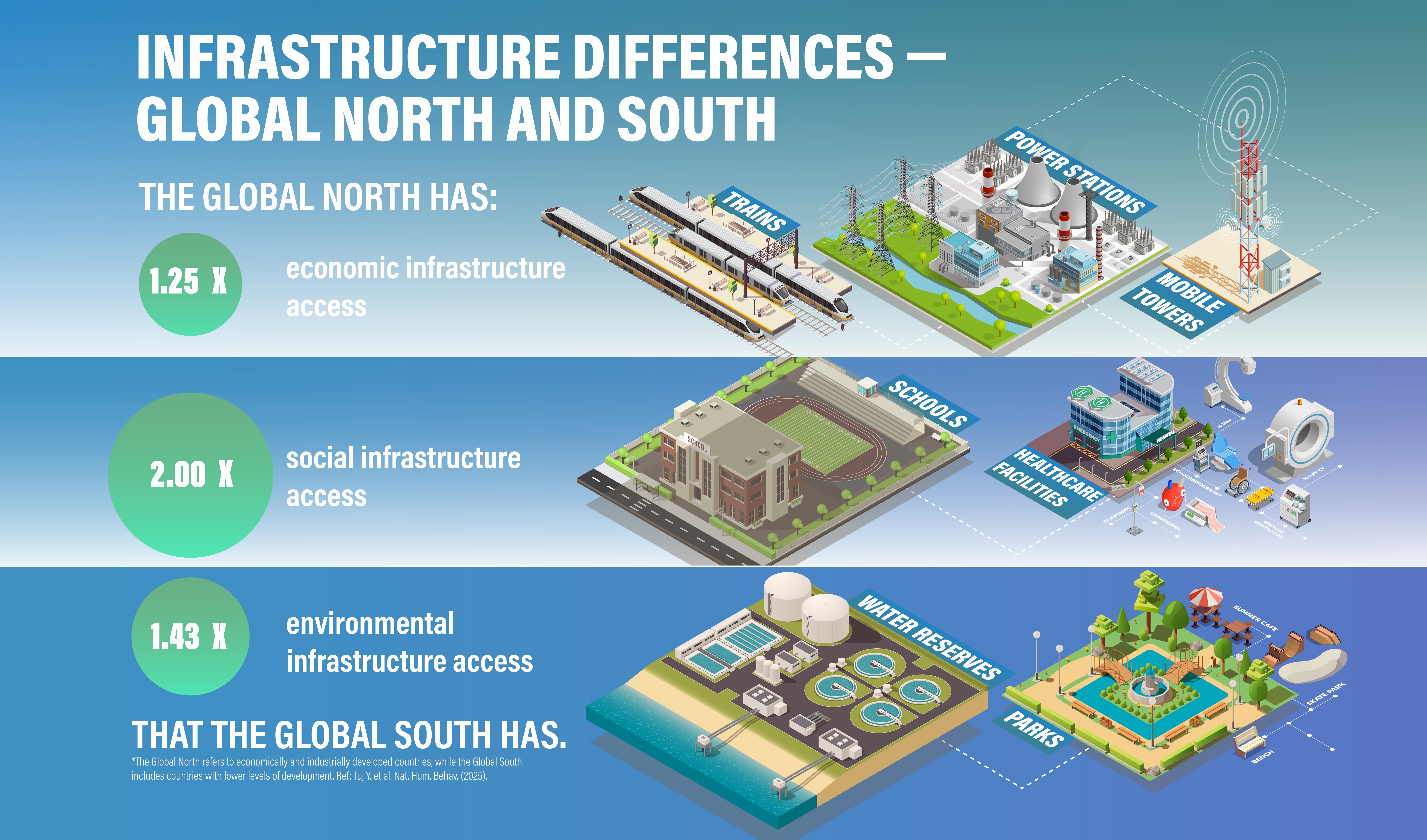 1. Tu, Y., Chen, B., Liao, C., Wu, S., An, J. et al. Inequality in infrastructure access and its association with health disparities Nature Human Behaviour 9, 1669–1682 (2025).