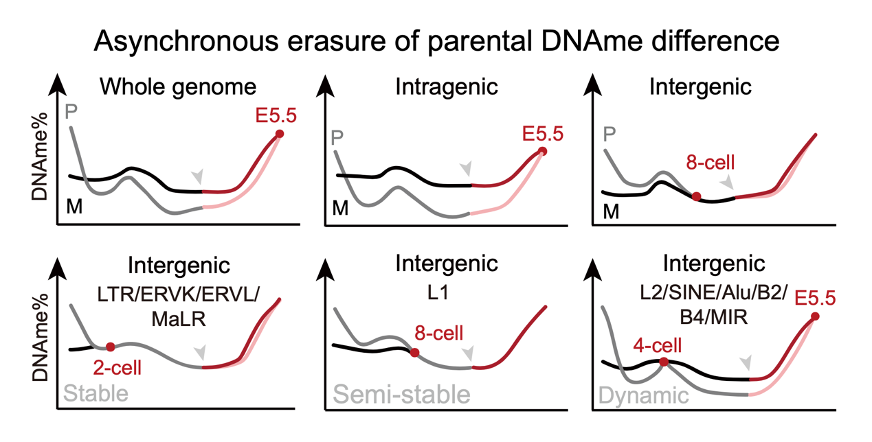 Differential DNAme between parental genomes is known to regulate imprinted-gene expression and to enforce asymmetric silencing of transposable elements, yet how this parental bias evolves throughout the pre- to post-implantation transition (PPT) in mammals has not been systematically charted. Here the research group demonstrates that the erasure of parental DNAme differences follows a subtype- and element-specific timetable, and that this pattern is independent of embryo sex or mouse strain. The asynchronous dynamics observed across parental genomic compartments—particularly within transposons and retrotransposons—raise the possibility that these stage-dependent changes contribute to early embryonic gene regulation and influence lineage fate decisions (Figure 2).