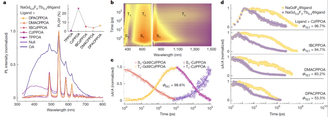 To elucidate the photophysical processes at the Ln-NC/organic molecule hybrid interface, the team employed various transient and temperature-dependent spectroscopic techniques. They observed a lanthanide-nanocrystal-induced acceleration of intersystem crossing (ISC) in the organic molecules (<1 ns), with an ISC efficiency reaching 98.6%. Notably, carbazole-modified phosphine oxide (CzPPOA) exhibited the most efficient triplet energy transfer (TET) efficiency to the lanthanide ions, achieving 96.7%. Further investigation revealed that this rapid TET benefits from well-matched energy levels facilitating endothermic TET and a significant suppression of interfacial non-radiative losses. The clarification of this ultrafast mechanism helps establish design principles and optimization directions for triplet exciton injection into insulating nanocrystals.