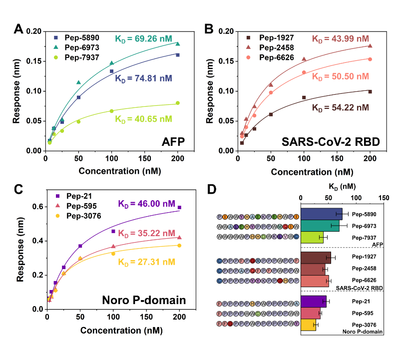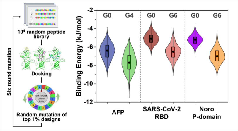 High-throughput virtual screening still faces many challenges in the process of expanding the library capacity to enhance the diversity of peptide sequences and screen high-affinity peptides. Xiaohong Zhou’s research group devised a novel de novo design strategy, constructing a generation library containing 104 random peptides, and docking with target protein through a self-developed parallel high-throughput virtual screening program. By screening and randomly mutating the top 1% of peptides, this strategy can theoretically expand the library capacity to 1014 peptide sequences, from which the strongest affinity peptides are selected. As a proof of concept, this method has been successfully applied to screen a variety of target proteins, including tumor markers (alpha-fetoprotein) and viral surface proteins (Sars-CoV-2 receptor binding domain and Norovirus P domain), and successfully identified peptides with high affinities in the nanomolar concentration range (Figure 2). The generality and scalability of the study provide economical and efficient methodological support for the rapid discovery of high-affinity peptides, especially in response to sudden pandemic outbreaks.