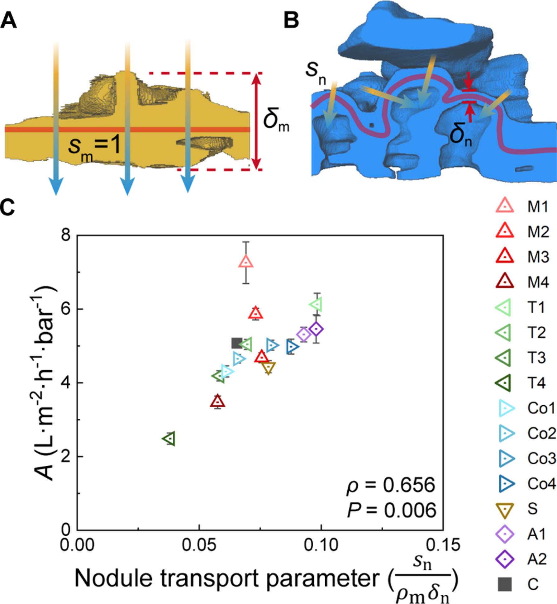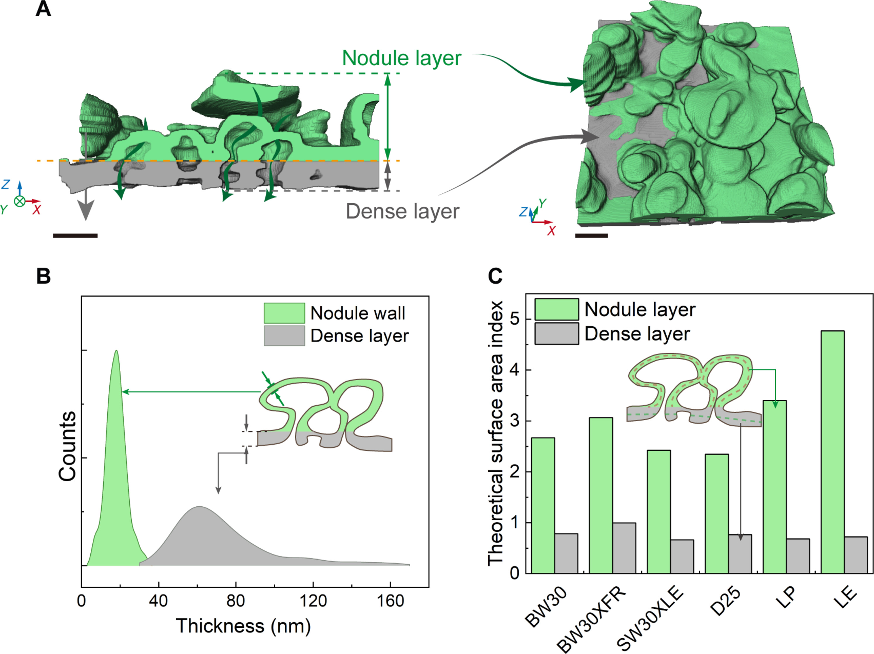 By analyzing the structural characteristics, the team divided the polyamide layer into two distinct regions: a Nodule Layer and a Dense Layer. The Nodule Layer, characterized by a high surface area index (~3.11), plays a far more critical role in mass transport than previously understood. Moving away from traditional transport models that treat the entire membrane thickness as a uniform resistance barrier, the researchers proposed a Nodule Transport Model. This model identifies the surface area index, nodule wall thickness, and relative density as the decisive structural parameters for water permeability. To validate this, the team conducted 3D reconstruction and performance analysis on 16 different synthetic membranes. The results showed a strong correlation (Spearman’s rank correlation coefficient ρ = 0.656) between the nodule parameters and actual water permeability, confirming the model’s accuracy and its potential to guide future membrane optimization.