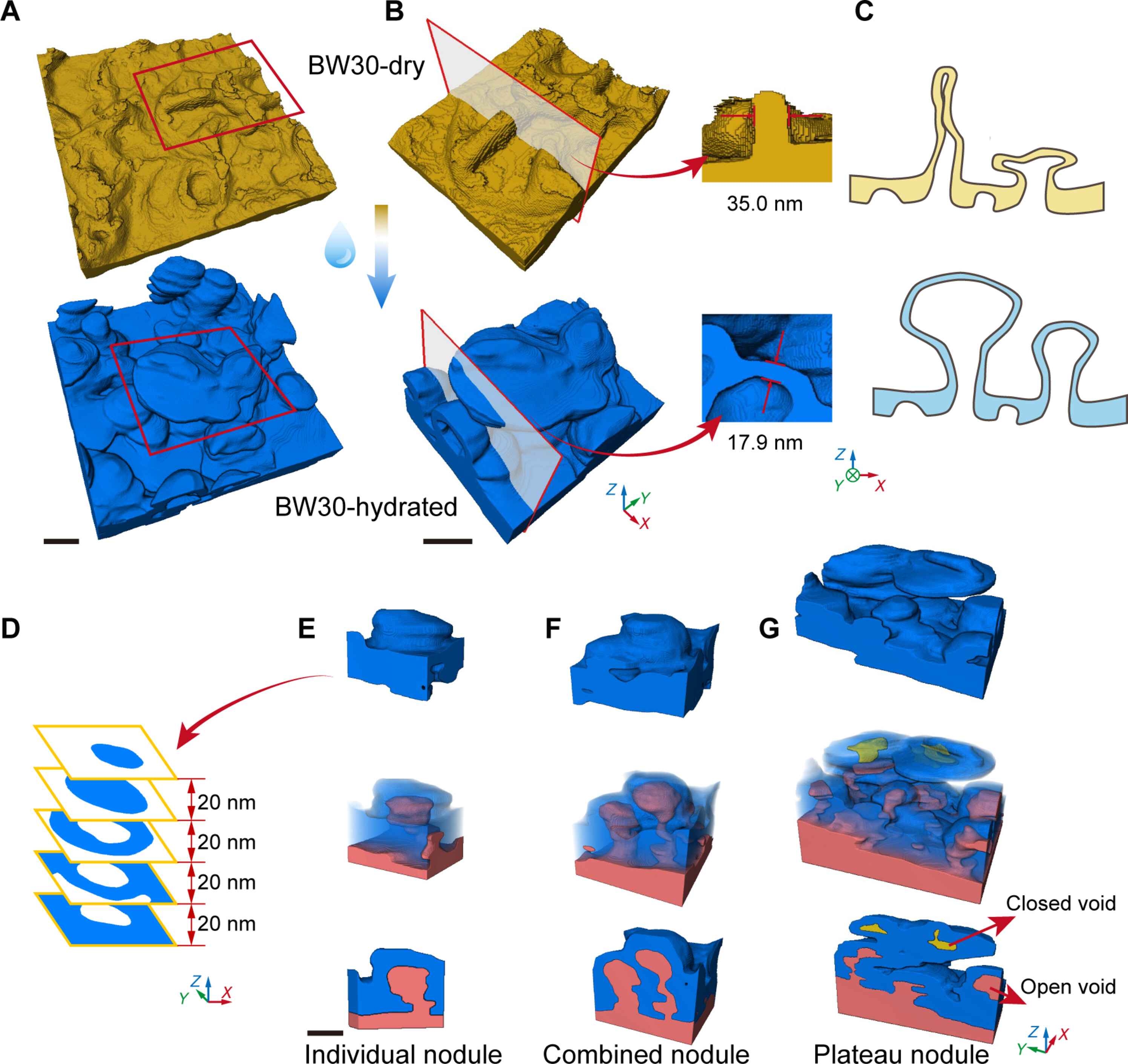 Fig. 1. 3D structural analysis of dry and hydrated BW30 membranes using conventional and Cyro-ET techniques.