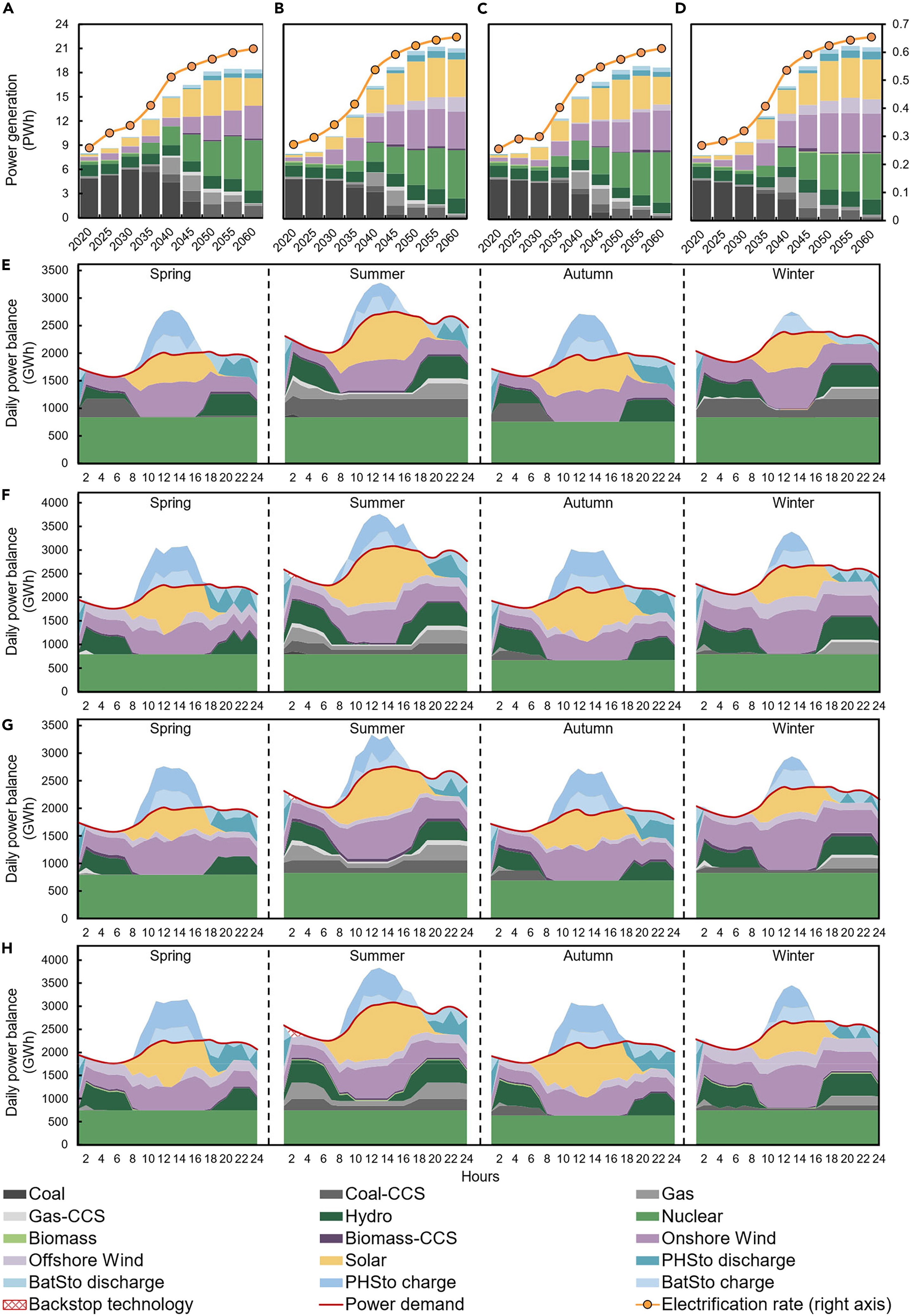 Figure 2. Power mix, electrification rates, and hourly power supply-demand balance under various net-zero scenarios.