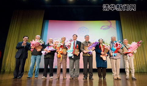 大会上,胡和平还为方惠坚、刘乃泉、吴肇基、谢文蕙、容文盛、杜建寰、张慕葏、吕林等8名1953年首批辅导员代表赠送了纪念铜牌,代表全体师生向他们表达了崇高的敬意。1953年,按照学习成绩优秀、政治觉悟高、工作能力强的原则,学校从全校各系的大三年级学生中精心挑选出25名同学,产生出了第一批学生政治辅导员。时至今日,这些首批辅导员都已年逾八十,但他们中的大部分还继续奋战在工作的岗位上,用自己的努力践行蒋南翔老校长提出的“为祖国至少健康工作50年”的要求。大会同时表彰了2012-2013学年度清华大学优秀辅导员,校党委常务副书记陈旭宣读了表彰决定,老辅导员校友和学校老领导为这些年轻的优秀辅导员代表颁发了荣誉铜牌,代表着辅导员的光荣在新老辅导员之间的传承。