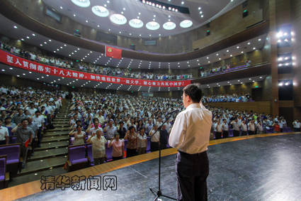 胡和平从深入学习宣传贯彻党的十八大精神,用中国特色社会主义理论体系武装头脑、指导实践;全面提高办学质量,加快建设世界一流大学,努力为全面建成小康社会作贡献;创新学校发展思路和模式,努力把世界一流、中国特色、清华风格统一和落实到办学实践之中;以基层党建工作为着力点,积极建设学习型服务型创新型党组织,不断提高学校党的建设科学化水平等4个方面,总结回顾了过去一年来学校各级党组织和广大党员认真学习贯彻中央精神,以改革创新精神推进学校党的建设和事业发展取得的显著成绩,对全校继续深入学习贯彻党的十八大精神和即将开展的党的群众路线教育实践活动等有关工作作了部署。