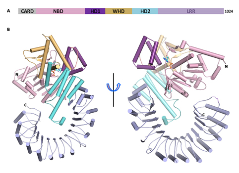 目前已经鉴定出的NOD样受体家族至少包含22种人类成员和34种鼠源成员。NLRC4是NOD样受体家族中的一员,主要识别细菌的鞭毛蛋白和III型分泌系统的成分。NLRC4在正常情况下通过自抑制作用处于静息状态;当病原体成分进入细胞内时,被NLRC4识别从而使其活化;活化的NLRC4发生自身多聚化,形成炎症小体,产生一系列的免疫应答反应。目前对NLRC4以及该家族其它蛋白是如何维持自抑制状态、如何识别配体以及如何激活等问题都不清楚。