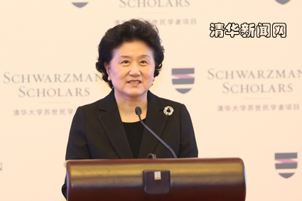 刘延东在致辞中说,习近平主席、奥巴马总统的祝贺表达了中美两国元首对教育与人文交流的重视和支持。人文交流是增进各国人民了解和友谊、促进国家合作共赢的重要途径,它与政治互信、经贸合作一道,已成为中国发展与各国关系的三大支柱。刘延东指出,加强人文交流,基础在教育,未来在青年,关键在民众的参与。高等教育作为人文交流的重要组成部分,应为培养具有世界眼光、综合素质、卓越能力的学生创造条件,为21世纪成为和平、发展、合作、共赢的世纪作出独特贡献。刘延东认为,“清华大学苏世民学者项目”立足教育、面向青年、多方合作,探索了人文交流的新模式,相信在大家的共同努力下,此项目一定能办成促进高等教育发展的典范、培养青年领军人才的摇篮、深化人文交流合作的平台。刘延东希望清华大学坚持内涵发展,不断改革创新,努力向世界一流大学前列迈进,同时也希望更多的中国高校积极参与中外人文交流合作,全面提升高等教育的质量和办学水平,为实现中华民族伟大复兴的“中国梦”,建设持久和平、共同繁荣的和谐世界作出新的更大贡献。