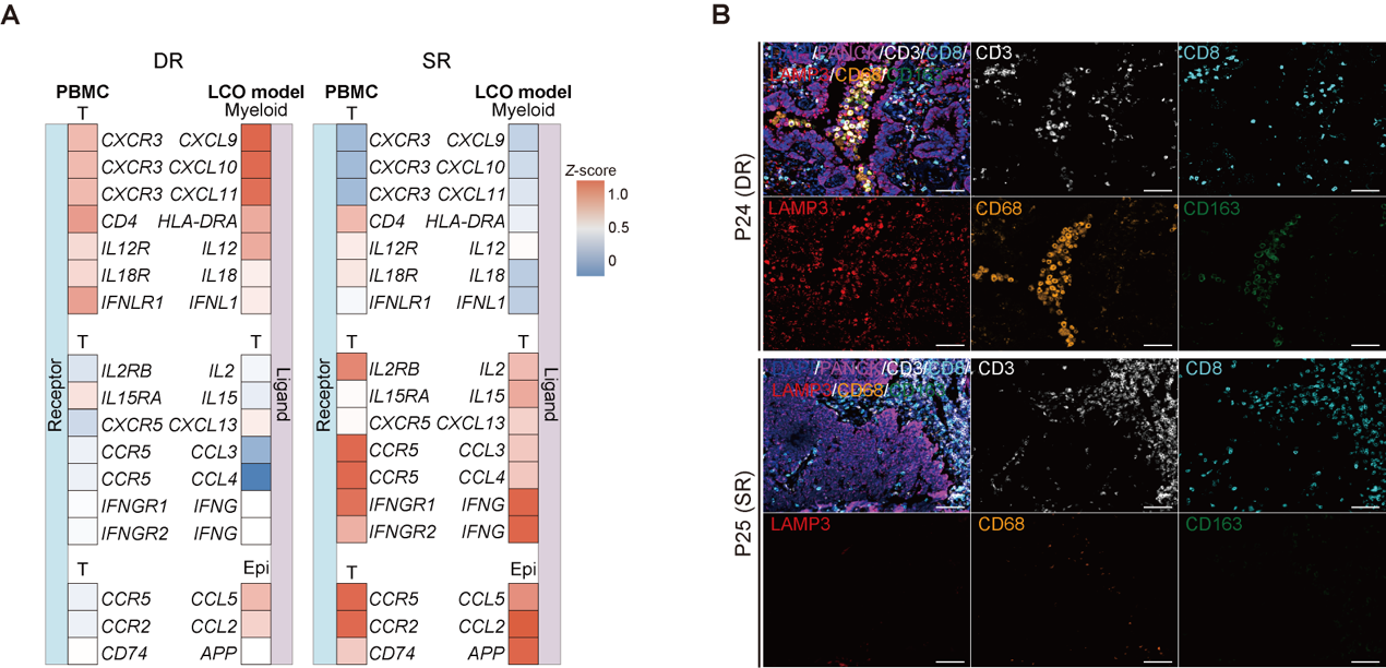 进一步归纳不同患者模型的免疫响应模式,研究发现对αPD1治疗存在“双响应”(即LCO与GLI模型皆存在响应)的患者中,其PBMCs具备更高比例的干性与增殖特征的T细胞亚群(Tprof),且其类器官微环境中富集了促进T细胞募集的巨噬细胞和树突状细胞亚型;而在“单响应”(仅GLI共培养模型存在响应)的患者中,则主要依靠部分上皮细胞对T细胞的趋化作用,以及进一步的T细胞内部正反馈激活与招募效应。这一现象进一步表明,肺癌患者对免疫治疗的响应结果是由肿瘤微环境与外周免疫状态共同决定的(图6)。