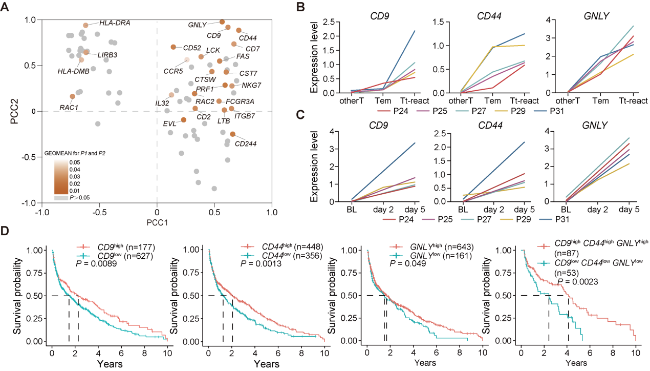 通过将肿瘤杀伤表型与单细胞转录组数据进行整合分析,研究鉴定出GNLY、CD44和CD9三基因在Tt-react群体中持续高表达,且与αPD1治疗响应显著相关。这三种标志物不仅在多例肺癌患者样本中得到验证,亦在TCGA肺癌队列中与患者总生存期(OS)呈正相关(图5),显示出潜在的临床预测价值。