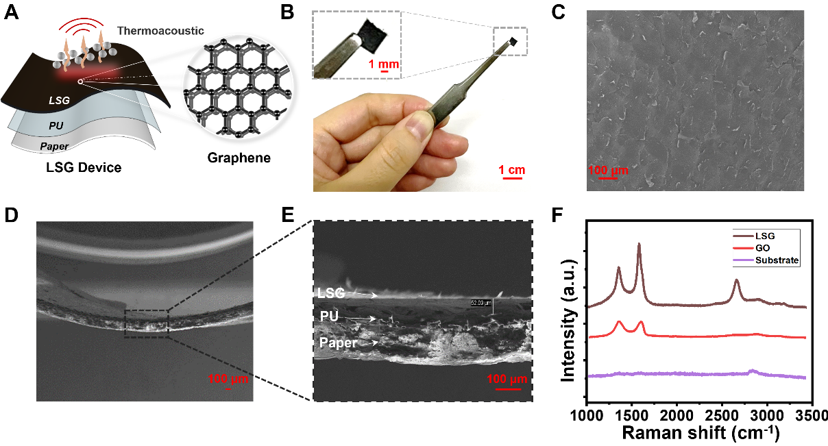 图2A为基于石墨烯的多层声源器件结构。该器件以激光直写石墨烯(LSG)为核心,中层为聚氨酯柔性膜,下层为透气纸纤维基底,形成独特的“三明治”结构。制备过程包括氧化石墨烯涂覆、激光还原及电极连接,其核心创新在于超薄PU-LSG复合体可贴附于任意曲面,器件尺寸仅3.5×3.5毫米(图2B)。扫描电镜显示LSG表面均匀平整(图2C),截面呈现50微米厚三层柔性结构(图2D-E)。拉曼光谱表明激光处理后出现多层石墨烯特征峰(图2F)。