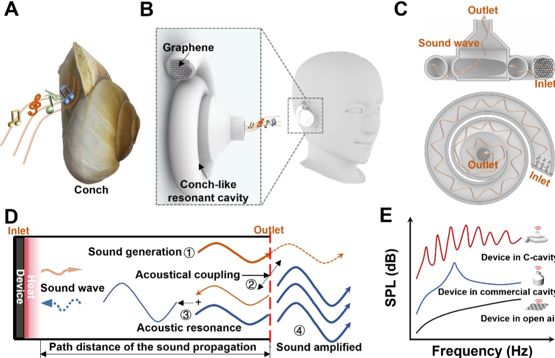 相关研究成果以“基于石墨烯热声共振腔体的可调频声音增强研究”(Frequency-tunable sound amplification in a conch-like cavity with graphene thermoacoustic resonance)为题,于6月4日发表于《科学进展》(Science Advances)。