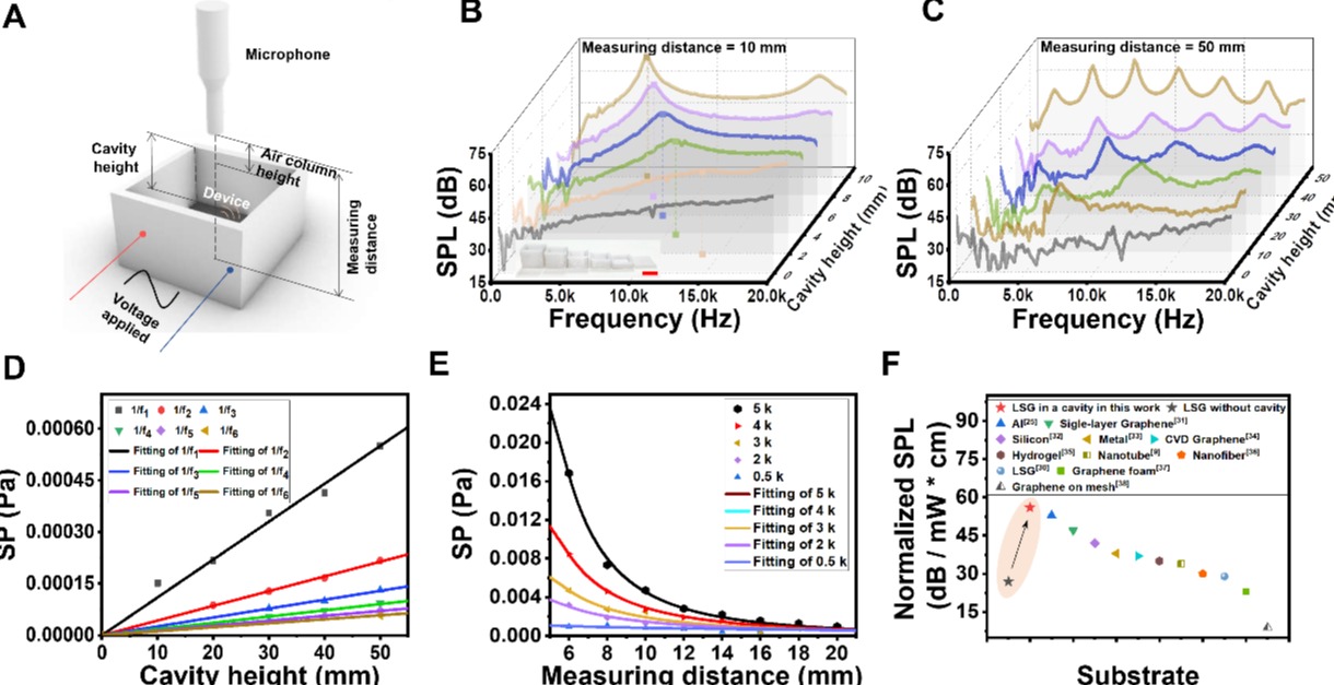 石墨烯声学器件及仿生腔体的增效机制获实验验证(图3):研究团队搭建了标准化测试平台(图3A),首先采用3D打印制备了直腔体,底部集成LSG声源,顶部配置高灵敏麦克风。实验表明,当腔体高度从0增至10毫米时,5.4千赫兹频率下的声压级实现39分贝到71分贝跨越式提升,并验证了声传播路径与谐振频率成反比(图3B)。随着腔体高度增至50毫米,可听域范围内谐振峰数量增至六个,基础频率f1由17.2千赫兹降至1.8千赫兹(图3C-D)。研究证实了腔体高度,即声波传播距离,是影响谐振频率的核心参数。性能对比显示(图3F),该器件在5.4千赫兹处达56dB·mW⁻¹·cm⁻¹,较无腔体状态提升107%。