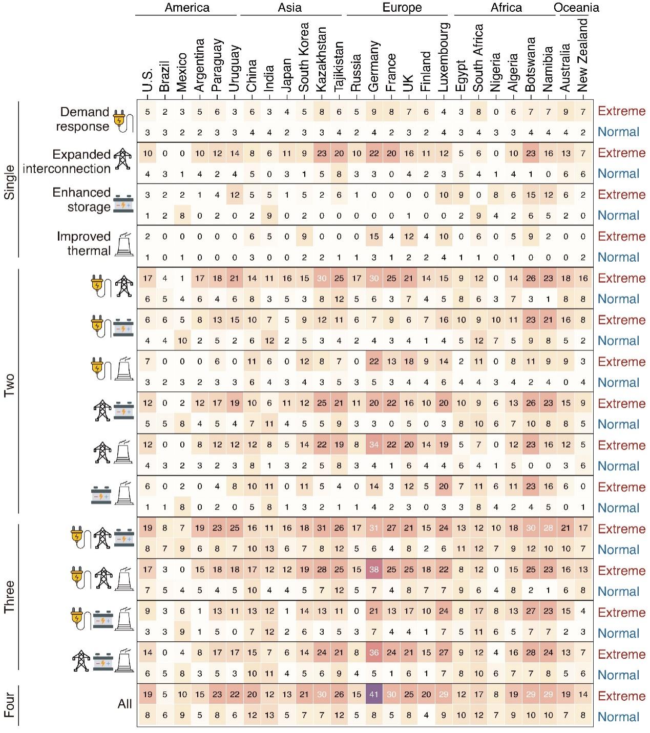 最后,研究基于需求侧响应、跨区域互联、储能效率提升和火电灵活性增强等4项应对措施,面向全球风光电力系统设计组合出15种气候适应与韧性提升策略,量化评估了不同策略对降低电力系统成本的成效。研究发现,尽管大部分单项措施可降低系统成本,组合多项措施的策略通常可获得更佳成效。例如印度在实施任意单项措施时极端时段成本最高降幅为6.3%,而实施任意2项或3项措施组合时成本最高降幅可达到10.8%或12.3%(图2)。然而,单纯依靠增加措施数量并非推动成本下降的最佳策略,需在考虑各国资源禀赋的基础上因地制宜、科学施策,优化措施组合以实现成本效益最大化。