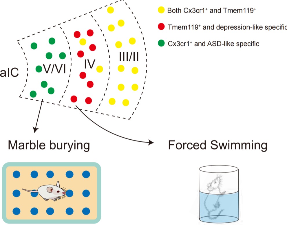 8月6日,清华大学生命学院姚骏团队在《分子精神病学》(Molecular Psychiatry)杂志发表了题为“前岛叶皮层通过两种不同分布的小胶质细胞分别调控抑郁样和自闭样行为”(Anterior insular cortex regulates depression-like and ASD-like behaviors via the differential contribution of two subsets of microglia)的研究论文。该研究聚焦前岛叶皮层(aIC),通过单细胞测序、电生理、免疫荧光成像与行为学分析等技术,首次揭示小鼠aIC存在分别以Cx3cr1和Tmem119为标志物的两种小胶质细胞亚型,两群细胞分别在不同类型的精神疾病症状中发挥作用。