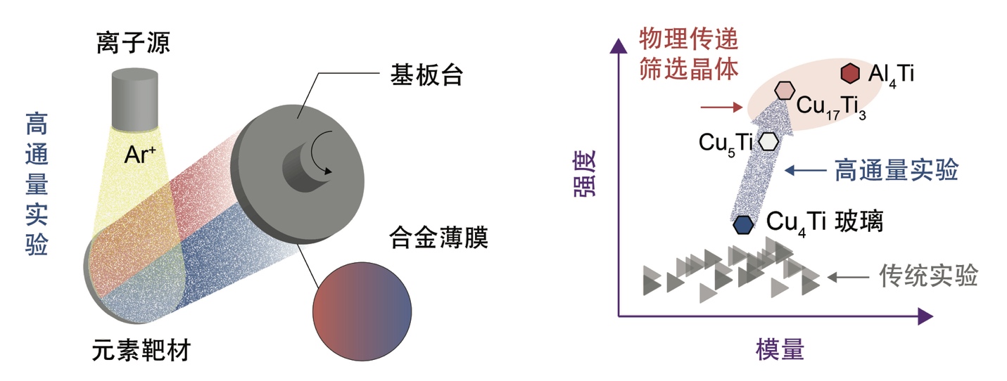 这种对晶体变形物理的数据表达取代了传统上依赖理论模型开发的经验研究方式,充分利用了材料数据库与多尺度建模技术。借助该框架,仅通过单点高保真度计算,便能准确预测多种金属体系的Peierls应力。该物理量可以整合进晶体塑性理论框架,构建起宏观材料力学性能与微观变形物理之间的定量连接。针对神经网络结构的分析进一步表明,在引入“原子应变”表征材料原子尺度非均匀应变,有效传递了固溶强化变形机制。在物理传递方法预测结果的引导下,中国科学院力学研究所蒋敏强研究员和物理所孙保安研究员课题组通过实验方法探索了金属合金材料相图中的亚稳区域。通过离子束溅射沉积镀膜技术结合高通量材料制备成功研发出具有优异力学强度的CuTi、AlTi等二元合金(图3)。