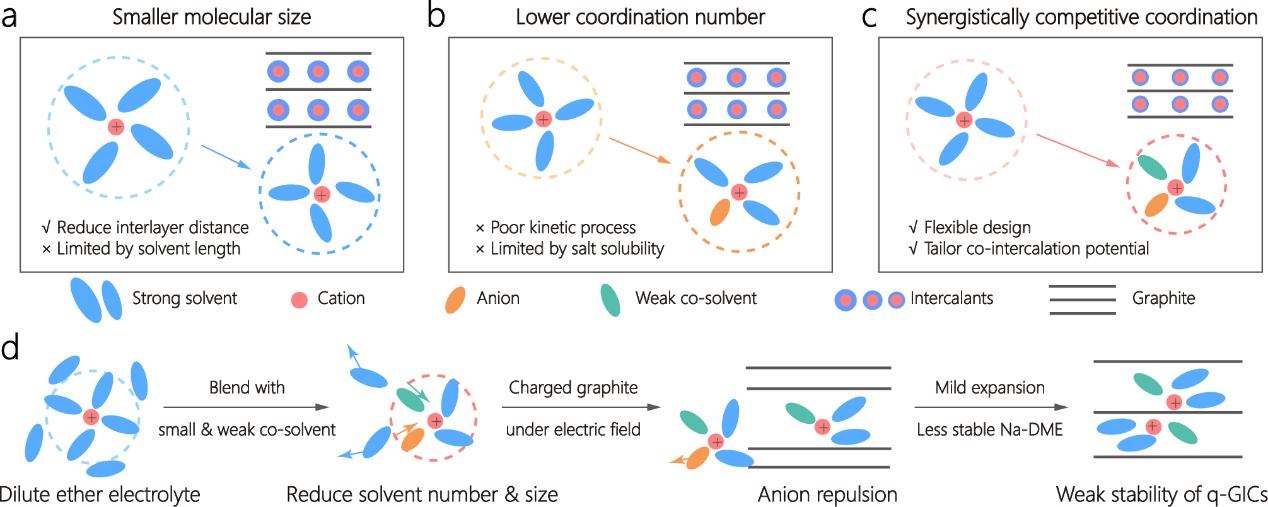 图1. 通过协同式竞争配位机制调控钠电石墨负极共插层电位的示意图