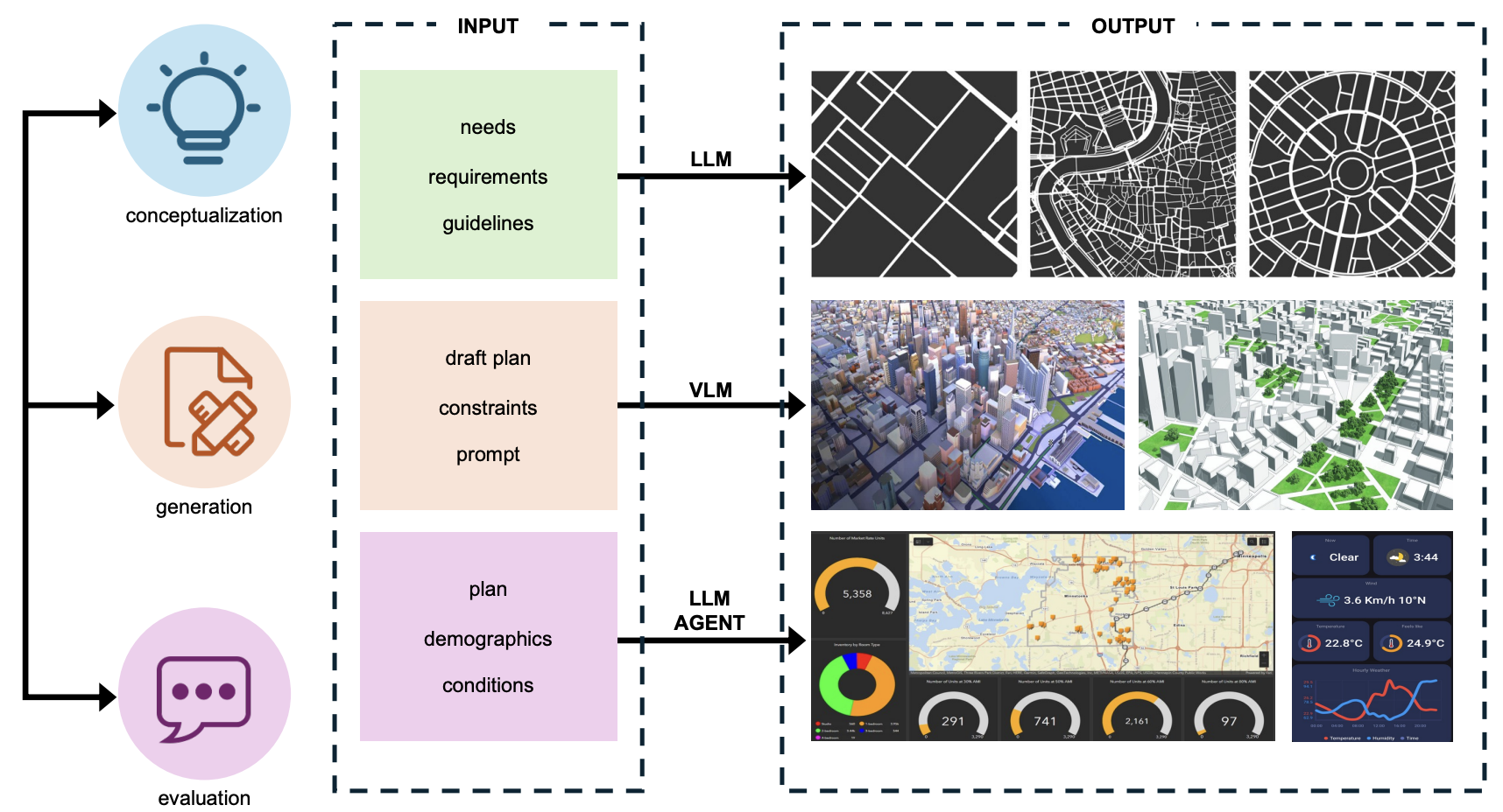图1.提出的大语言模型驱动的城市规划框架。该框架整合LLM、VLM和LLM智能体,形成“概念-生成-评估”的协同工作流