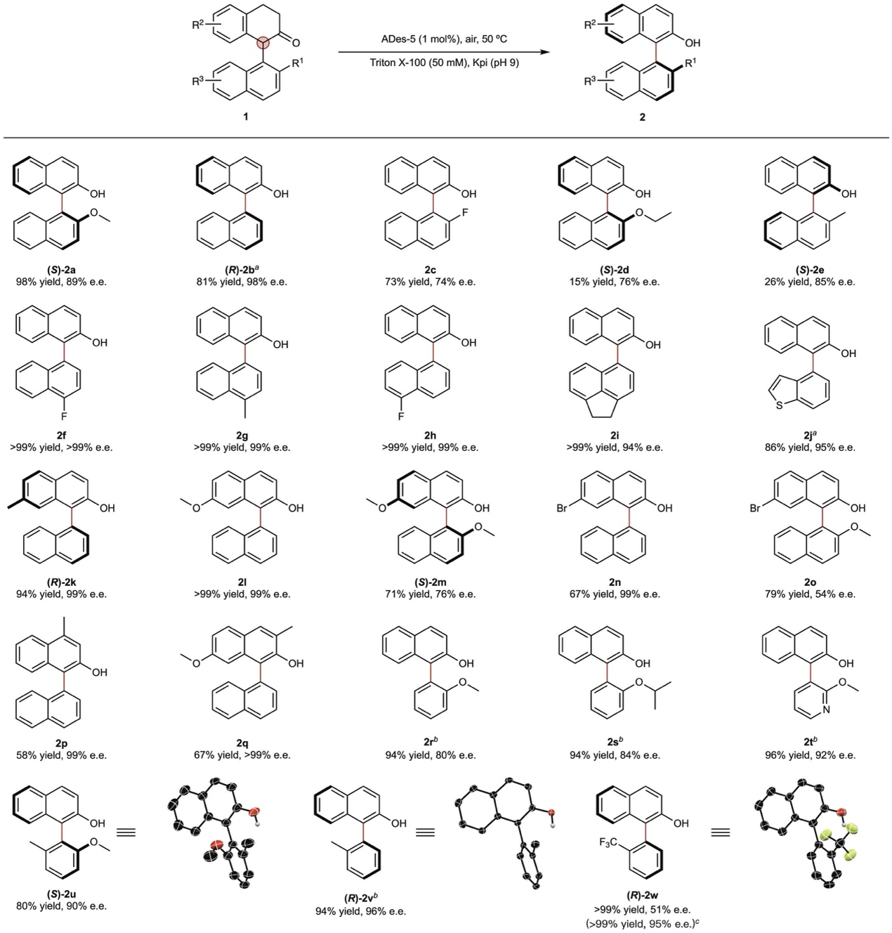 在确定最优变体ADes-5后,研究团队评估了其在多种1-芳基-2-四氢萘酮衍生物上的适用性。结果表明该酶对芳环的各种取代基都表现出显著的耐受性,无论是卤素、杂环还是氧化敏感的底物,均可被高效转化为目标联芳基产物,且具有良好的产率与对映选择性。