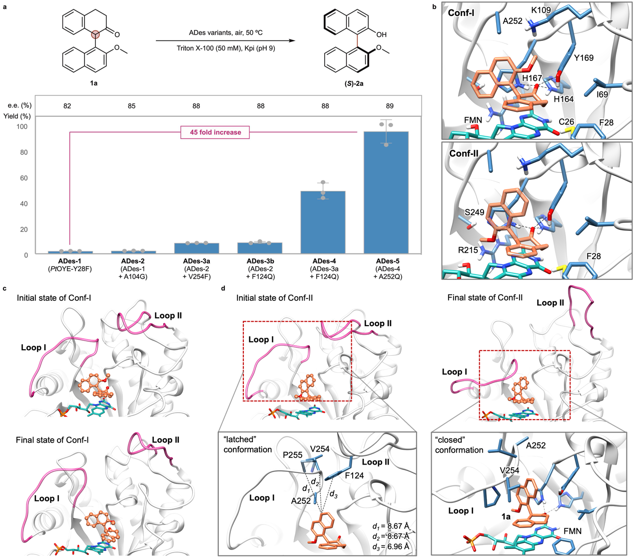对模拟结果中的结构进一步可视化分析表明:第一,在初始构象中,Loop II上的F124与LoopI上的P255和A252通过疏水相互作用形成“锁扣”结构,限制了Loop I的闭合;第二,在最终的Loop I“闭合”构象中,疏水残基V254靠近底物并形成新的相互作用(图2d)。基于这些结构与动态信息,研究团队对F124、V254和P255三个位点进行了位点饱和突变筛选,旨在打破“锁扣”构象并稳定“闭合”构象,从而促进底物的结合和催化。筛选得到的F124Q与V254F变体分别对反应收率提升了3.8倍和3.4倍,二者组合后得到的双突变体ADes-4,使产率提升至50%,对映选择性达到88% e.e.。进一步在A252位点进行突变和筛选,获得了催化性能最优的ADes-5,其产率高达98%,对映选择性为89% e.e.,和初始变体ADes-1相比,产率提升了45倍。