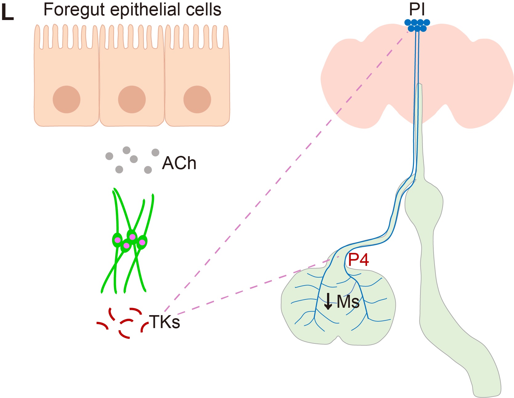 图4.气管细胞释放速激肽作用于P4泵和PI神经元的环路示意图