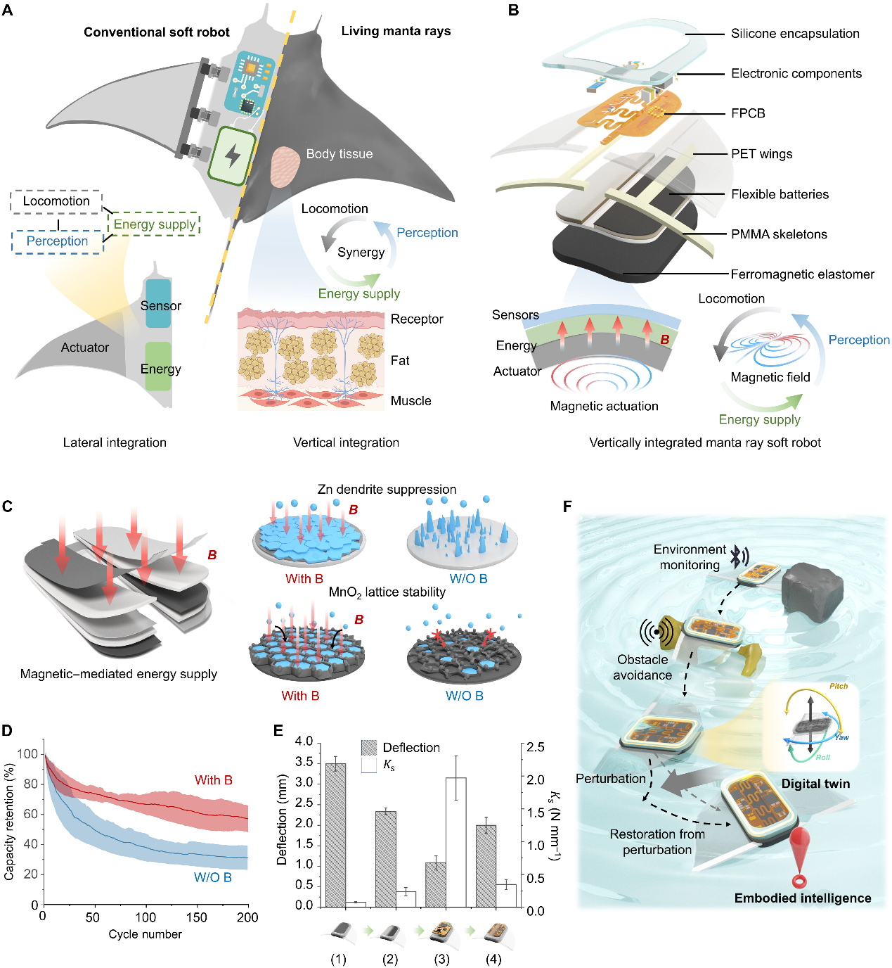 近日,清华大学深圳国际研究生院丁文伯副教授所在的智能感知与机器人(Smart Sensing and Robotics, SSR)课题组与周光敏副教授课题组合作提出了一种磁驱动柔性电池集成机器人。该机器人集成的抗形变柔性电池,在机器人固有磁场增强下表现出优异性能,在200次循环后的容量保持率具有57.3%。这种柔顺电池可在机器人本体上实现44.9%的大面积部署,并通过与合理设计的柔性混合电路进行垂直集成,在保持可变形性的同时将额外刚度降至最低。这种执行器–电池–传感器的柔性垂直集成方法最大化了功能区域的利用率,并在仿鳐鱼软体机器人中得以实现,从而构建了一个具备感知、通信和稳定供能能力的无束缚平台。该系统在水下环境中展示了具身智能,包括扰动修正、避障和温度监测等多样化功能,并通过本体感知与环境感知实现了磁驱动运动过程中的实时决策。