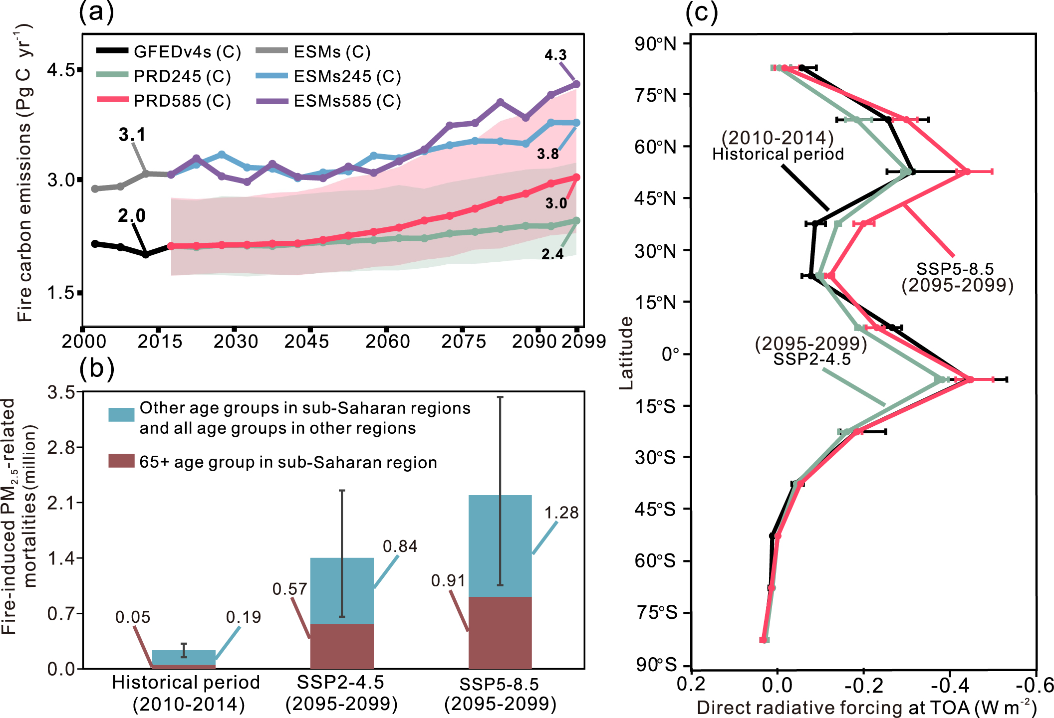 图1.野火排放的历史变化、未来预测及其对PM₂.₅健康效应和直接辐射强迫的影响