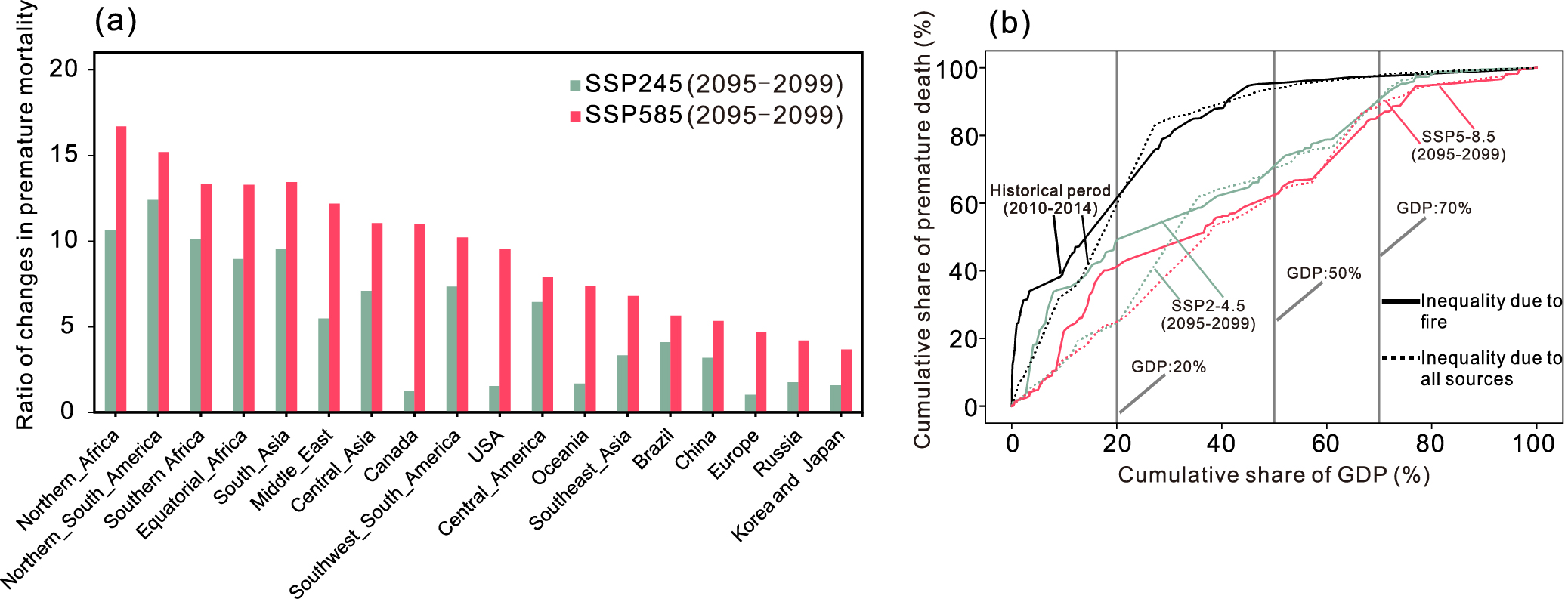 研究发现,随着气候变暖与干旱加剧,未来全球野火活动将显著增强。在中等排放情景(SSP2-4.5)下,到本世纪末,全球野火碳排放与当前水平相比预计增加约23%,全球每年约有140万例过早死亡可归因于野火烟雾PM₂.₅暴露,为当前水平的6倍(图1)。全球变暖不仅加剧野火污染健康风险,也改变了其在不同区域和经济体之间的分布特征。欠发达地区在全球未来野火健康负担中的占比仍然巨大,然而在全球高升温情景(SSP5-8.5)下,未来发达国家地区野火活动大幅增多,在人口老龄化趋势下,其野火健康风险在全球的占比将明显提升,影响了野火PM₂.₅暴露健康风险的区域差异化格局(图2)。