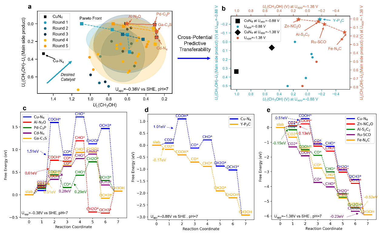 另外,团队聚焦于二氧化碳电还原制甲醇的催化剂的活性与选择性筛选这一重大技术挑战,提出了一套由AI驱动的高通量催化剂筛选框架。以预训练的原子基座模型为基础,结合主动学习策略,仅用少量的DFT计算数据就能快速微调出高精度预测模型。该方法将催化剂吸附性能的筛选效率提升了千倍以上,成功从3000多种候选材料中发现了一系列综合性能超越现有基准的新型单原子催化剂。相关成果以“结合原子基座模型与主动学习加速二氧化碳转化催化剂的理论高通量筛选”(Theoretical High-Throughput Screening of Single-Atom CO2 Electroreduction Catalysts to Methanol Using Active Learning)为题,于8月5日发表于中国工程院院刊《工程(英文)》(Engineering)。