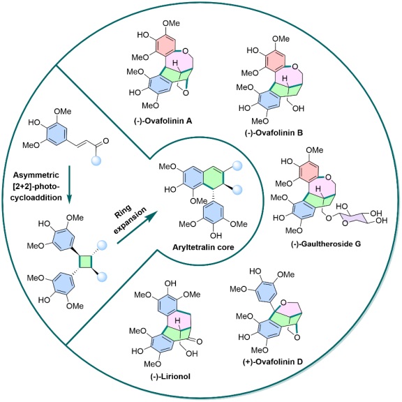 基于上述设计思路,唐叶峰课题组发展出一条简洁高效的合成路线。该路线以手性磷酸催化的不对称[2+2]环加成反应、环张力驱动的氧化扩环反应以及局部去对称化的二烯酮-苯酚重排反应为关键步骤,成功实现了卵叶灵芝(ovafolinins)A、B、D以及麝香百合醇(lirionol)和白珠树苷(gaultheroside)G等一系列复杂多环芳基四氢萘型天然产物的对映选择性全合成。所有目标分子的合成步骤均控制在十步以内,整体反应选择性良好,总产率较高。与已有文献报道的合成方法相比,该研究在简洁性和合成效率方面均有显著提升,不仅为该类天然产物提供了一条新颖高效且具有普适性的合成路径,也为深入研究其生物活性与药用价值奠定了坚实的物质基础。此外,该研究还通过全合成修正了天然产物白珠树苷(gaultheroside)G的原有结构,充分展现了全合成在天然产物结构确证中的关键作用。