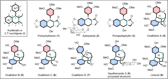 木质素(Lignans)是一类由两个或多个苯丙素单元通过不同方式连接形成的天然产物,涵盖多种结构亚型,其中芳基四氢萘型木质素(Aryltetralin lignans)最为常见。该类化合物及其衍生物具有广泛的生物活性,一直被视为发现新药和先导化合物的重要资源。例如,鬼臼毒素(Podophyllotoxin)在临床上用作抗人乳头瘤病毒(HPV)药物,而依托泊苷(Etoposide)作为拓扑异构酶Ⅱ抑制剂被广泛用于癌症治疗。近年来,研究人员陆续发现了一系列结构更为复杂的多环芳基四氢萘型木质素,这些分子通过侧链官能团与母核之间形成新的C-O或(和)C-C键,从而构建出高度拥挤的多环体系。由于其显著的生物活性和合成挑战性,木质素类化合物一直是天然产物全合成领域的研究热点。尽管该类分子的合成研究屡见报道,但利用仿生苯丙素二聚化反应构建此类天然产物的合成策略尚未得到充分利用。究其原因,主要在于非酶催化条件下该类二聚化反应通常面临复杂的选择性(化学、区域、立体和对应选择性)问题。因此,如何精准调控该类反应的选择性,成为实现木质素类天然产物仿生合成所需要解决的关键科学难题。