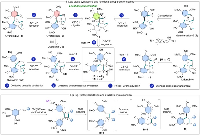 唐叶峰课题组长期致力于天然产物仿生合成研究。在深入分析多环芳基四氢萘型木质素的结构特征与生源合成途径的基础上,团队巧妙利用分子中隐含的对称性元素,提出了“将非对称目标分子追溯至对称前体”(Symmetrizing the Unsymmetrical)的创新合成策略,其核心思想是将具有同二聚和异二聚骨架的木质素分子均逆推至同一种具有对称性的合成前体,以建立统一的合成路线。概括而言,首先通过光诱导[2+2]环加成反应实现苯丙素单元的同二聚化,生成具有对称性的二芳基环丁烷中间体;继而利用环张力驱动的氧化扩环反应,实现两个芳基单元的去对称化,从而构建芳基四氢萘型木质素的三环核心骨架。在此基础上,通过氧化去芳香化/分子内环化反应,将侧链芳基转化为双烯酮结构,进一步借助C-C或C-O键参与的双烯酮-苯酚重排反应(dienone-phenol rearrangement)实现局部去对称化(local desymmetrization),最终分别得到形式上属于异二聚体和同二聚体的两类多环芳基四氢萘型木质素。