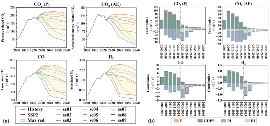 研究团队通过自下而上的核算方法,构建了2000年以来包括4类成分、15个行业、28种尾气的中国省域排放数据库,并基于共享社会经济路径(SSP)情景、生产端和消费端低碳策略情景,将排放规模外推至2060年。同时,研究团队通过对数平均迪氏指数分解(LMDI)模型对人口(P)、经济水平(GDPP)、生产强度(PI)、排放强度(EI)等驱动因素开展分析。研究结果表明,中国过程碳排放及伴生可利用尾气规模可观,2023年过程碳排放(CO2(P))、伴生能源碳排放(CO2(AE))、伴生CO、伴生H2规模分别达到18.2亿吨、12.5亿吨、1.7亿吨、0.3亿吨,具有较大利用潜力。在综合减排情景(se09)下,到2060年低碳策略可分别减少82%和94%的CO2(P)和CO2(AE)。当前碳减排主要依赖工业生产结构调整,未来将转向技术驱动。