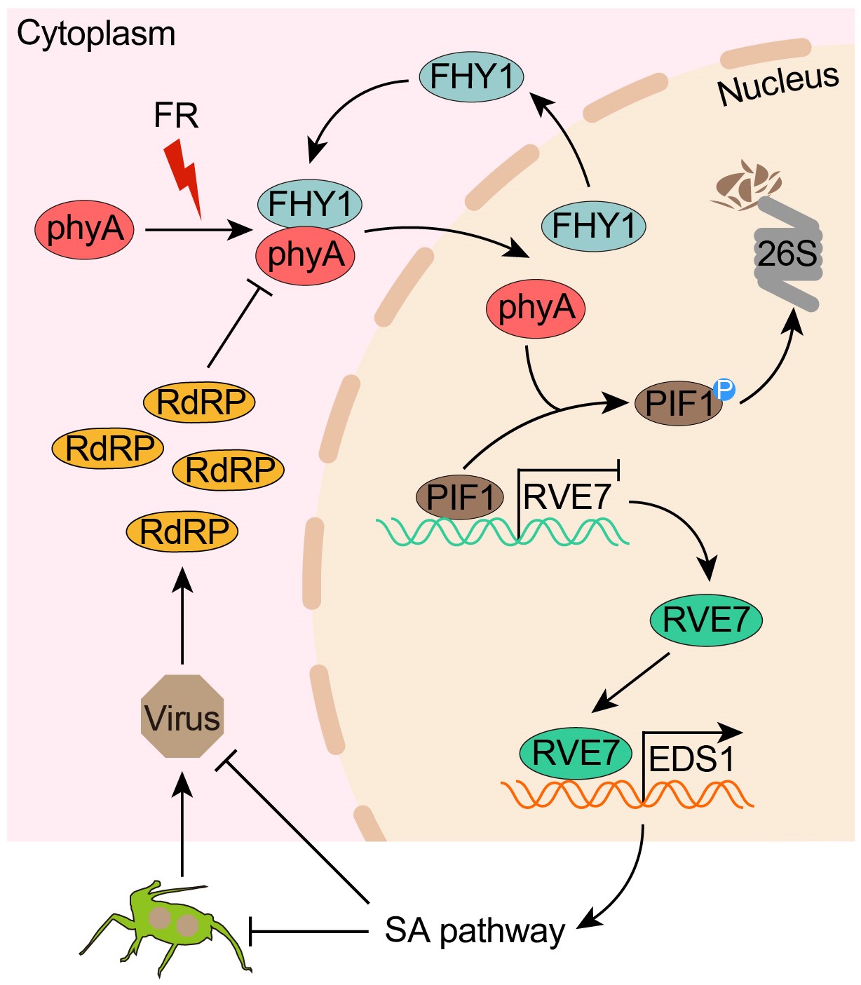 研究发现,在远红光照射下,phyA被激活并转入细胞核,促使转录因子PIF1发生泛素/26S蛋白酶体依赖的降解,解除其对转录因子RVE7(REVEILLE7)的抑制。随后,RVE7直接结合免疫核心调控因子EDS1(Enhanced Disease Susceptibility 1)的启动子,增强水杨酸(SA)信号通路,从而显著增强植物对多种病毒的抗性。值得注意的是,该远红光诱导的phyA–RVE7–EDS1信号模块不仅抵御病毒感染,还同时提高了植物对蚜虫的抗性,实现了对病毒病害的“双重阻断”。