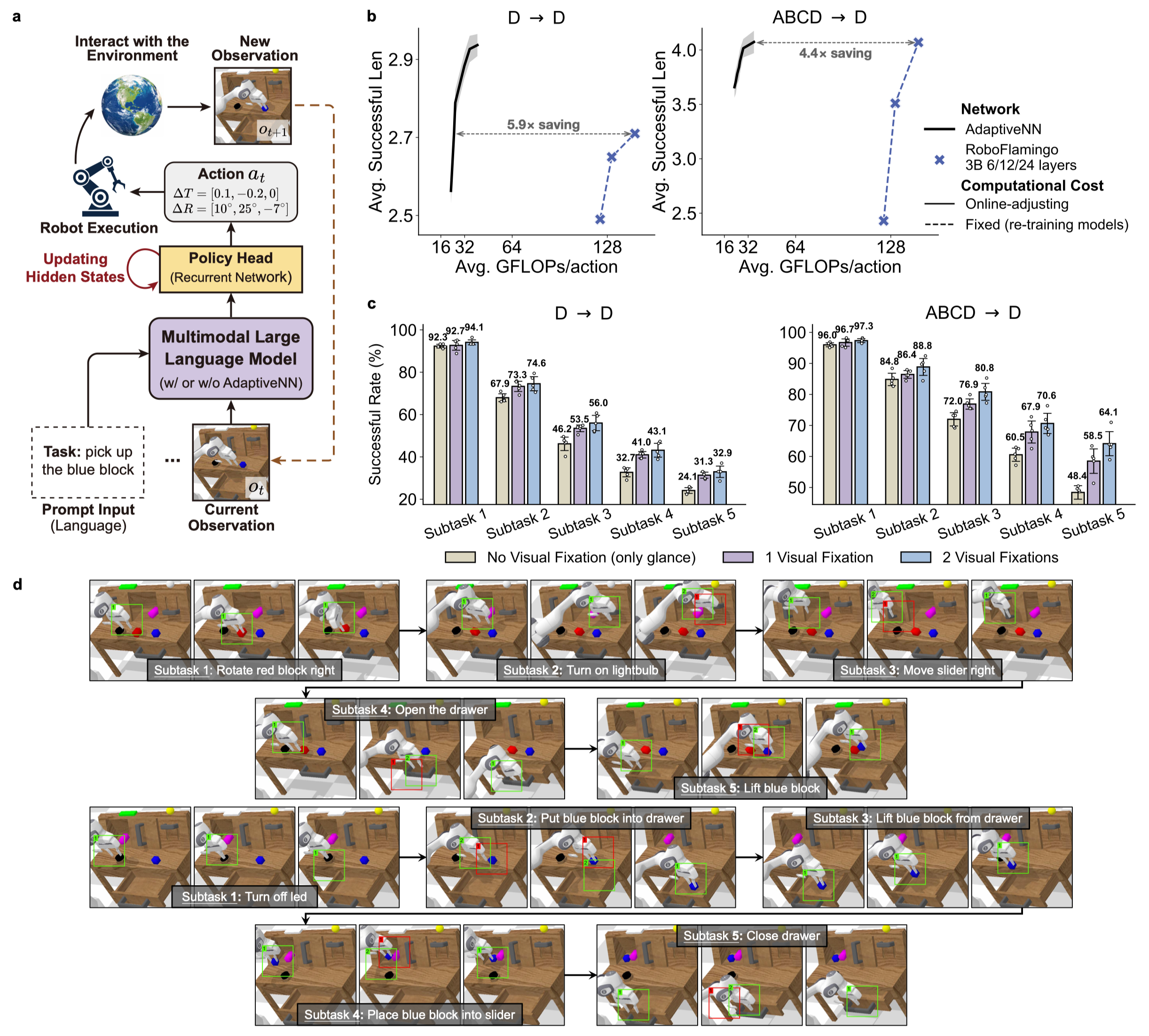 研究团队进一步将AdaptiveNN应用于具身智能的基础模型——视觉语言动作模型(VLA)。结果表明,该框架在复杂操作场景中显著提升了具身基础模型的推理与感知效率,在保持任务成功率的同时将计算效率提升4.4至5.9倍。