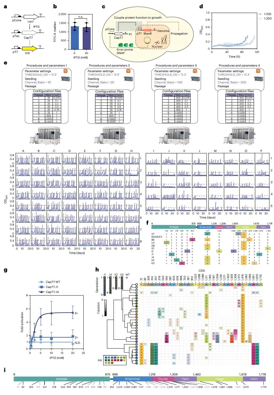 利用该系统对活性近乎为零的前体CapT7进行蛋白质功能进化。为了赋予T7 RNAP加帽能力以扩大其应用效果,团队将非洲猪瘟病毒的加帽酶与其进行融合,有望应用于哺乳动物细胞中的正交基因表达和疫苗开发等领域。在该平台上进行了一个完全自动化多组平行的定向进化过程,在96孔板中并行启动超过100条独立进化线,每天9个循环进行连续25天,再接入连续流式装置追加10天高浓度筛选,最终获得变体CapT7-V14。该变体在酵母内使靶基因表达提升30倍;在体外转录反应中可合成带帽mRNA;在HEK293T细胞中,其驱动的荧光蛋白水平与CMV、EF1α等哺乳动物强启动子相当,实现“原核启动子直接用于人源细胞”的跨界表达。