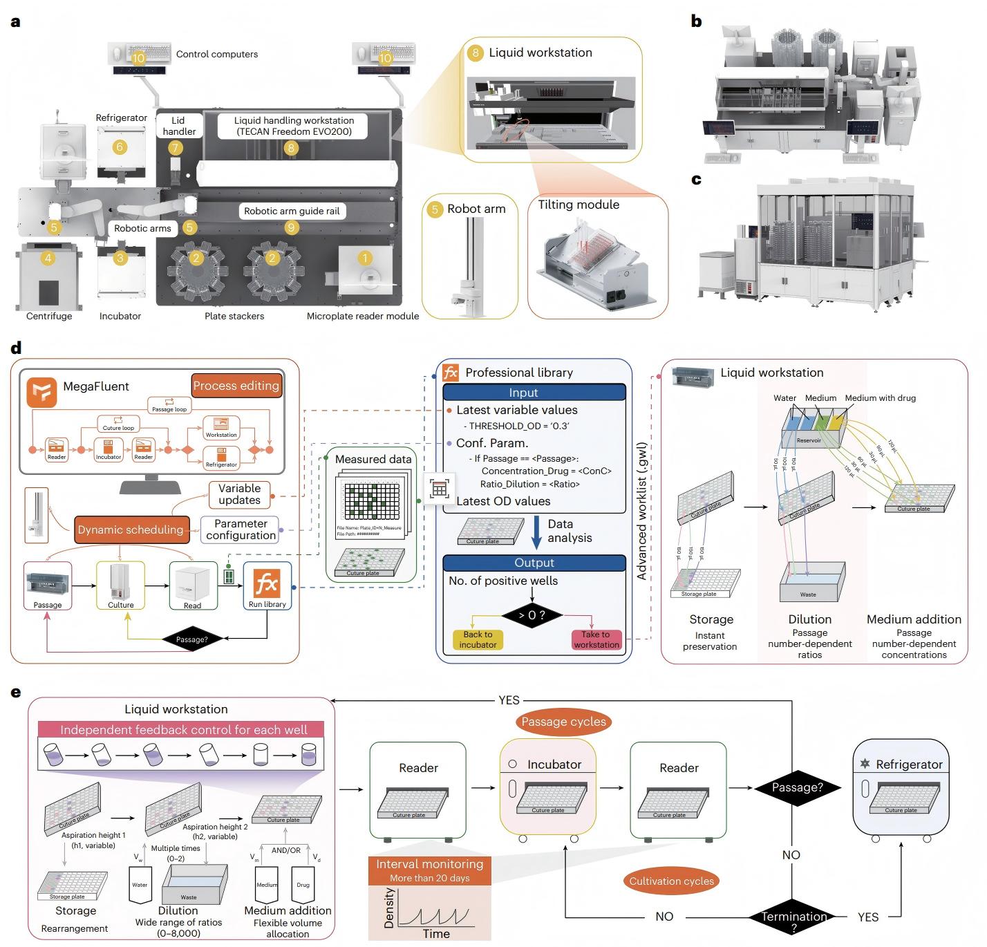 硬件方面,iAutoEvoLab无缝集成了包括液体处理工作站、培养箱、自动化机械臂、酶标仪、冰箱和计算控制系统等一系列关键组件。所有核心设备安置在一个半封闭环境中,除培养箱和冰箱等设备外,整套系统处于无菌环境,防止反应池受到污染。软件方面,MegaFluent控制软件负责协调和执行整个工作流程。硬件设备获得读数以后,由MegaFluent进行处理和评估,并根据结果对流程分支进行决策,以完成后续诸如保存培养物、传代、稀释、更换培养基及调节筛选压力的一系列流程。