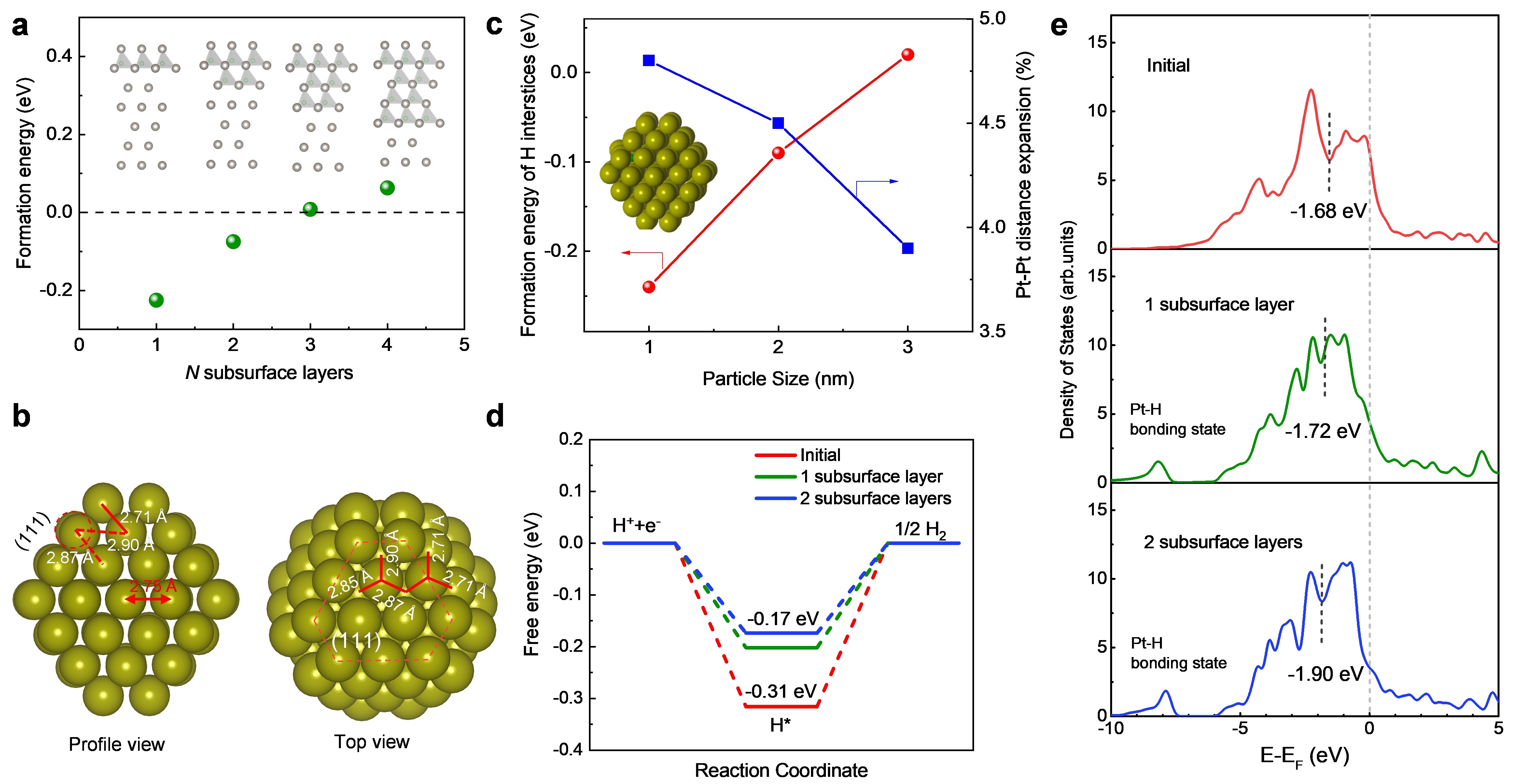 图3.铂纳米颗粒表面氢化物的形成能及其对氢电催化活性的影响