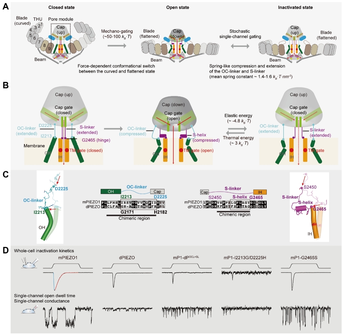 综上,该研究提出了PIEZO通道失活和随机单通道门控的弹簧样力学作用机制。该机制的核心在于,OC-linker和S-linker作为熵弹簧,位于通道顶部的帽状结构与跨膜孔道之间。当机械力使帽状结构下移、桨叶区展平时,连接器从伸展的高熵状态转换为压缩的低熵状态,储存弹性势能,从而打开孔道,引发通道激活;随后,被压缩的连接器倾向于恢复其伸展状态,将帽状结构推回,促使帽状结构闸门关闭,通道快速失活。而在环境热力学扰动下,处于上移状态的帽状结构和伸展的连接器能再次下移和压缩,重新打开帽状结构闸门,使通道再次开放。这种弹簧式的压缩-释放机制使通道在稳态张力和环境热能作用下能实现可重复的开启-关闭循环,并决定了其随机而可控的单通道开关特性(图A、B)。